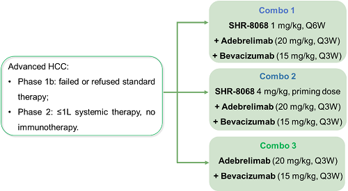 研究招募既往未经系统治疗或经系统治疗失败后的晚期HCC患者(Ib期,经标准治疗失败或拒绝标准治疗;2期:≤1线的系统治疗,且未接受过免疫治疗)。SHR-8068选择2个剂量与阿得贝利单抗和贝伐珠单抗联合:1mg/kg Q6W(联合队列1)或4mg/kg单剂(联合队列2)。另有一个队列单独评价阿得贝利单抗和贝伐珠单抗的安全性及疗效(联合队列3)。在所有队列中,阿得贝利单抗的剂量为20 mg/kg Q3W,贝伐珠单抗的剂量为15 mg/kg。主要研究终点为研究者依据RECIST v1.1评估的ORR和安全性。